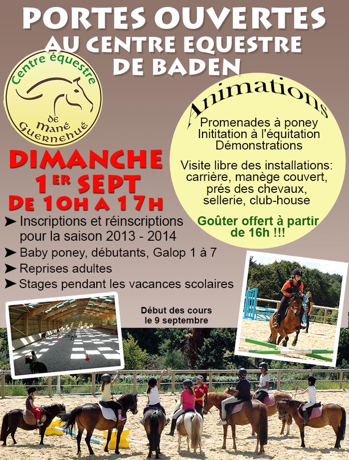 Portes Ouvertes au Centre Equestre de Baden dimanche 1er septembreJournée Portes Ouvertes au Centre Equestre de Mané Guernehué dimanche 1er septembre de 10h à 17h !